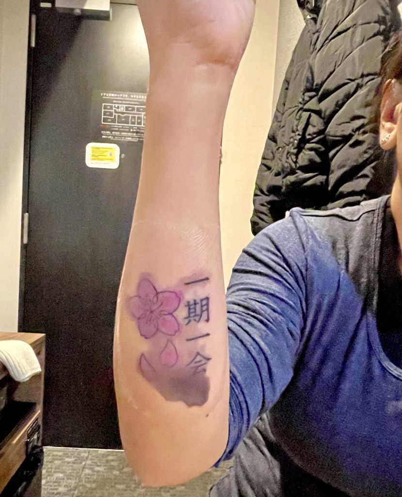 Since I was already in Japan, and many Japanese concepts like Wabi-Sabi, Ikigai, and Oubaitori resonate with me, I thought it would be fitting to include one as a tattoo. After reading more about different Japanese philosophies, “Ichigo Ichie” spoke to me the most. This Japanese phrase captures the idea of treasuring each moment as one-of-a-kind, reminding us to stay present and appreciate every experience as it comes. Each encounter is unique and will never happen the same way again.