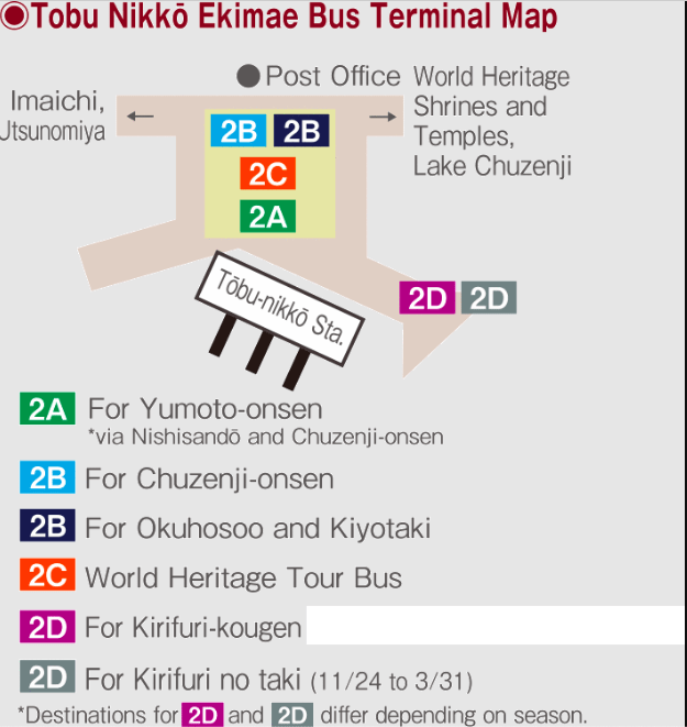 2D – Buses bound for Kirifuri Kogen, Ozasa Bokujo Farm, and Kinugawa-Onsen Station.
